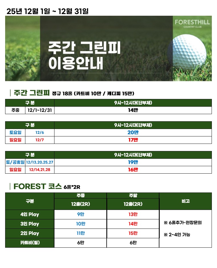 | 구분 | 주중 | 주말 | 6홀추가 | |